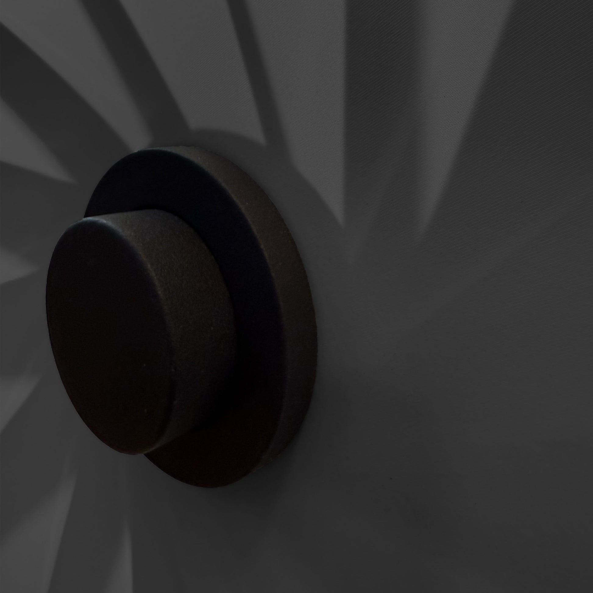 Solpuckens tyg av återvunnen högelastiskt ECONYL® polyamid blockerar störande solstrålar, utan att skymma ljus eller utsikt. Storleken justeras enkelt genom att de valsade fjäderstålbanden och tyget smidigt vrids in kring Solpuckens centrum. Med ett lätt klick kan den flyttas omkring.